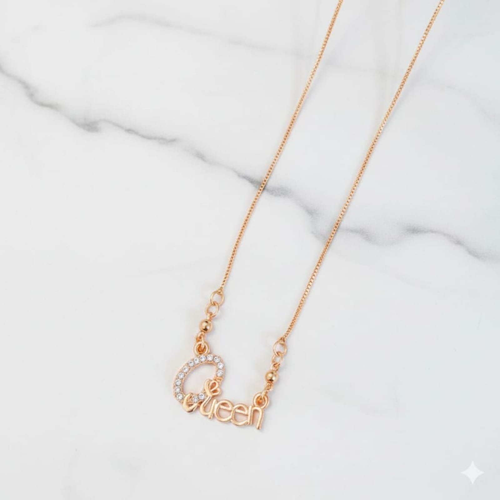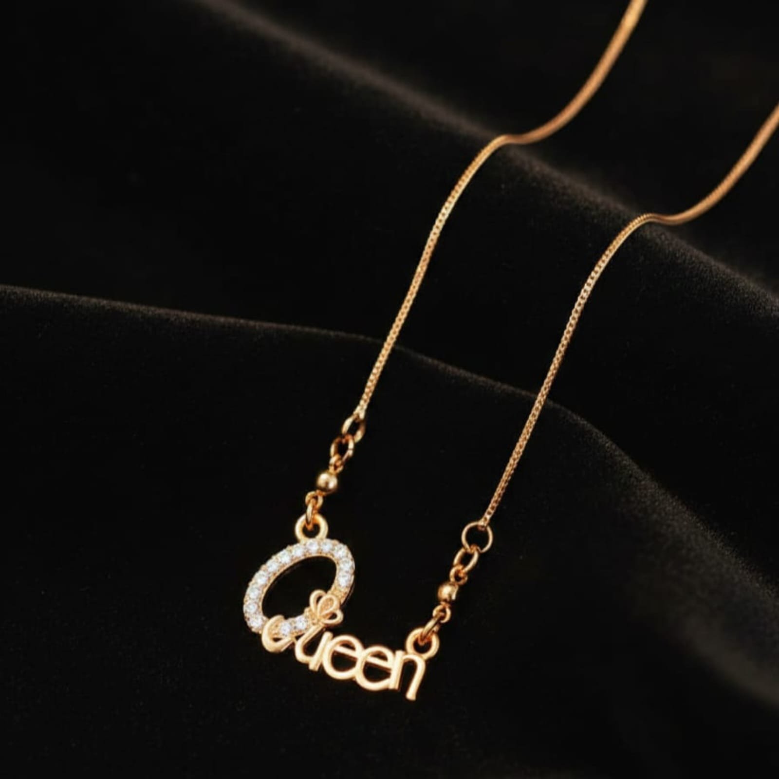 This stunning necklace features a beautifully crafted “Queen” script pendant in a premium gold-tone finish. The letter “Q” is delicately adorned with sparkling zircon stones, adding a luxurious shimmer that catches the light from every angle. The fine gold chain enhances its graceful look while ensuring lightweight comfort for all-day wear.